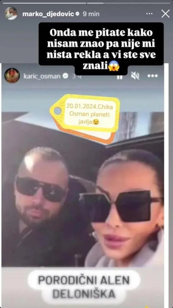 – Onda me pitate kako nisam znao, pa nije mi ništa rekla, a vi ste sve znali – napisao je Đedović obzirom da je Osman Karić 20.01.2024 objavio sliku Aneli i Alena.