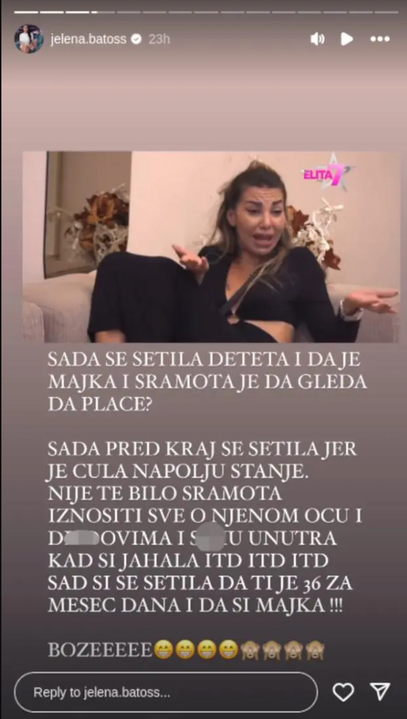 – Sada se setila deteta i da je majka i sramota je da gleda da plače? Sada pred kraj se setila, jer je čula napolju stanje. Nije te bilo sramota iznositi sve o njenom ocu i d**dovima i s*ksu unutra kad si jahala, itd, itd, itd, sad si se setila da ti je 36 godina, a mesec dana i da si majka. Bože – napisala je surovo Jelena Batos na Instagram profilu bez dlake na jeziku.