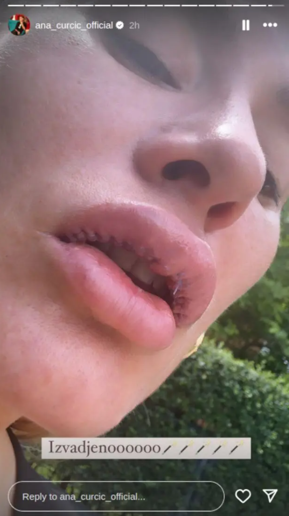 – Izvađeno – napisala je Ćurčićeva uz fotografiju na Instagramu koja prikazuje šavove na njenim usnama.