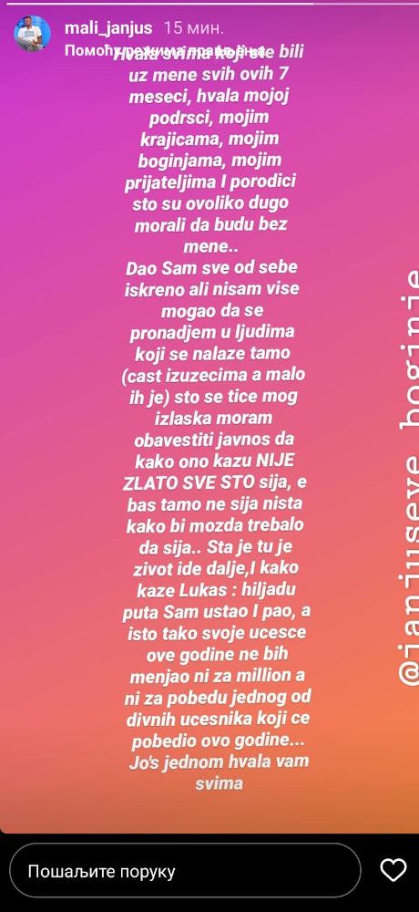 – Hvala svima koji ste bili uz mene svih ovih sedam meseci, hvala mojoj podršci, mojim prijateljima i porodici što su ovoliko dugo morali da budu bez mene. Dao sam sve od sebe iskreno, ali nisam više mogao da se pronađem u ljudima koji se nalaze tamo (čast izuzecima, a malo ih je). Što se tiče mog izlaska, moram obavestiti javnost da kako ono kažu, nije zlato sve što sija, e baš tamo ne sija ništa kako bi možda trebalo da sija. Šta je tu je, život ide dalje i kako Lukas kaže: “Hiljadu puta sam ustao i pao”, a isto tako svoje učešće ove godine, ne bih menjao ni za milion, a ni za pobedu jednog od divnih učesnika koji će pobediti ove godine. Još jednom hvala svima – napisao je Janjuš.