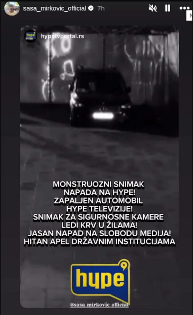 Naime, automobil koji je u vlasništvu Hype televizije večeras je namerno zapaljen, što predstavlja ozbiljan čin vandalizma i potencijalnu pretnju po bezbednost zaposlenih i imovine ove medijske kuće. Dramatične scene požara zabeležene su kamerama, a produkcija je upozorila da snimak koji sledi može biti uznemirujući za gledaoce. Nedugo nakon toga, snimak su radi bezbednosti obrisali.