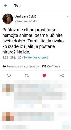 – Poštovane elitne prostituke nemojte snimati pesme, učinite svetu dobro. Zamislite da svako ko izađe iz rijalitija postane hirurg? Ne ide – napisala je Andreana, a jedan od njenih pratilaca upitao je na koga misli.