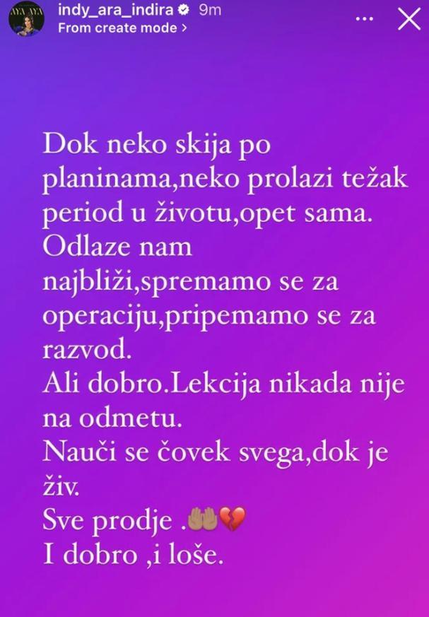 Nakon brojnih šuškanja da se Indi razvodi, ona je sada okačila Instagram priču koja može nagovestiti da su šuškanja o razvodu tačna, jer je pevačica očigledno razočarana.