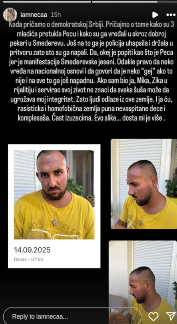 O ovom užasnom incidentu oglasio se njegov brat Nenad Lazić, koji je putem Instagrama podelio fotografije Pecinih povreda.