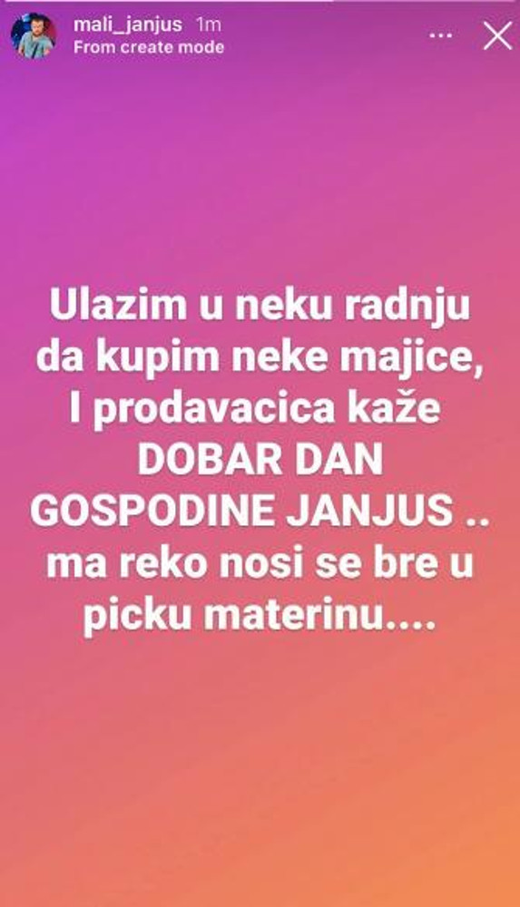– Ulazim u neku radnju da kupim neke majice i prodavačica kaže: ”Dobar dan, gospodine Janjuše”. Ma rekoh “nosi se bre u p*čku materinu” – napisao je Janjuš na Instagramu.