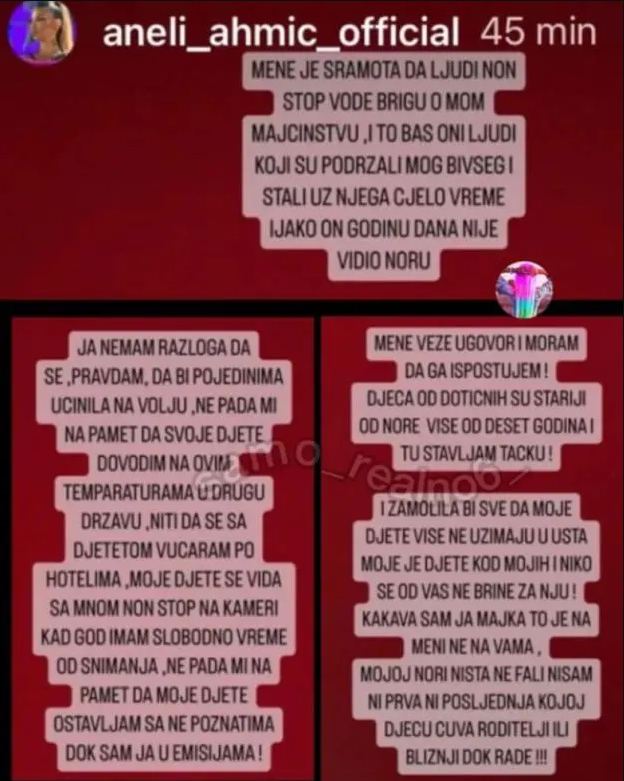 – Ja nemam razloga da se pravdam, da bih pojedinima učinila volju. Ne pada mi na pamet da svoje dete dovodim po ovim temperaturama u drugu državu, niti da se sa detetom vucaram po hotelima. Moje dete se viđa sa mnom non-stop na kameri kad god imam slobodno vreme od snimanja. Ne pada mi na pamet da moje dete ostavljam sa nepoznatima dok sam ja u emisijama – dodala je Ahmićeva.