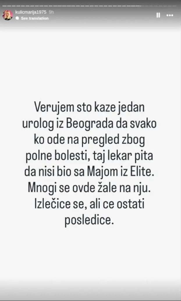 – Verujem što kaže jedan urolog iz beograda da svako ko ode na pregled zbog polne bolesti, taj lekar pita da nije bio sa Majom iz Elite. Mnogi se ovde žale na nju. izlečiće se, ali će ostati psoledice – stoji u objavi.