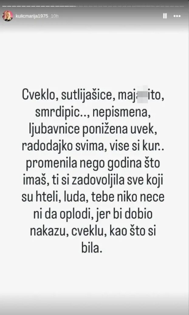 – Cveklo, sutlijašice, maja**to, nepismena ljubavnice, ponižena uvek, više si k. promenila nego godina što imaš. Ti si zadovoljila svakog sve koji su hteli, luda, tebe niko neće da oplodi jer bi dobio nakazu, cveklu, kao što si ti bila – napisala je Marija.
