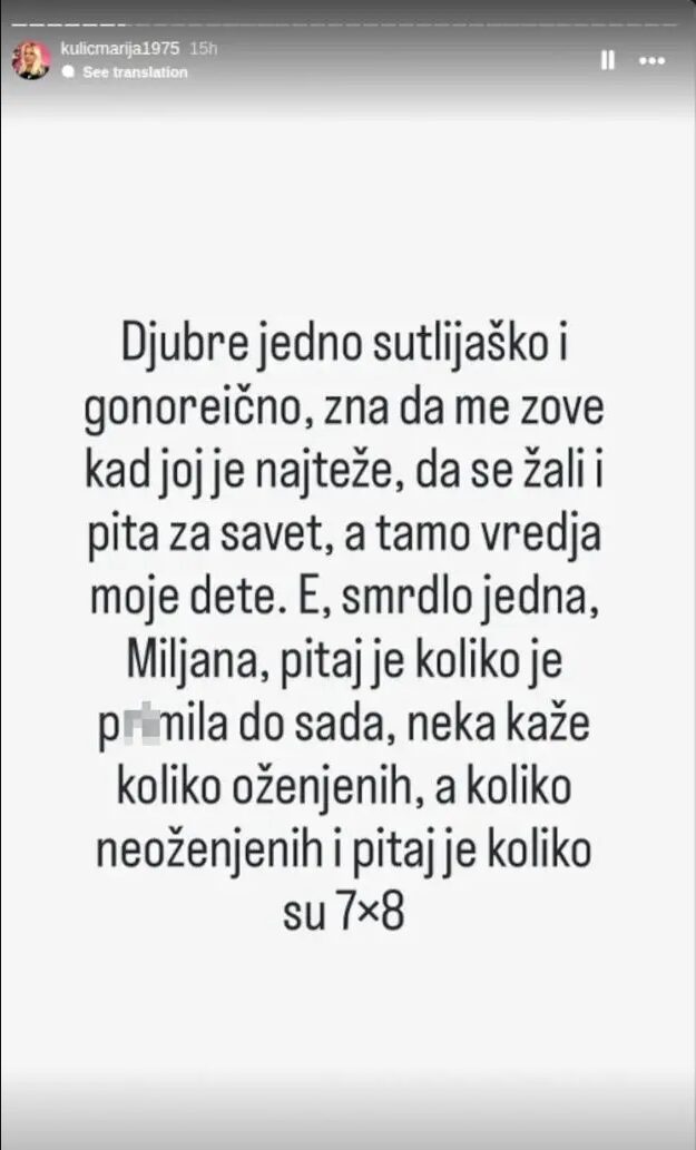 Đubre jedno sutlijaško i gonoreično, zna da me zove kad joj je najteže, da se žali i da me pita za savet, a tamo vređa moje dete. E, smrdlo jedna. Miljana, pitaj je sa koliko njih je bila do sada, neka kaže koliko oženjenih a koliko neoženjenih i pitaj je koliko su 7×8 – napisala je Marija, ali niej se tu zaustavila.