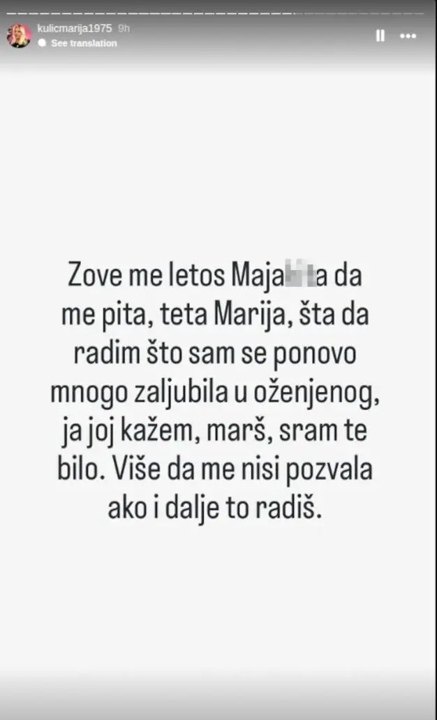 – Zove me letos Maja da me pita, teta Marija, šta da radim što sam se ponovo zaljubila u oženjenog. Ja joj kažem, amrš, sram da te bude. više da me nisi pozvala ako i dalje to radiš – napisal je Marija
