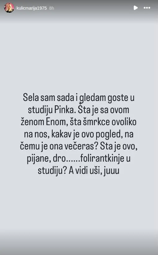 Ono što se nije promenilo, iako se Marija malo udaljila od rijalitija, jeste to da ona i dalje nema dlake na jeziku kad se namerači na nekoga. Ovoga puta, meta je bila Ena Čolić, odnosno njeno gostovanje u emisiji “Narod pita” kod Milana Miloševića.