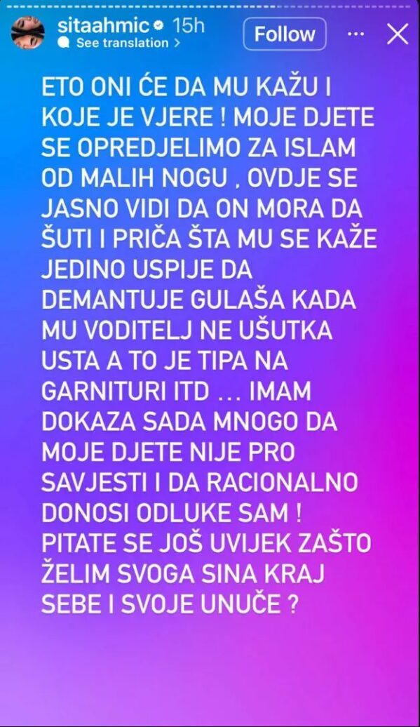 – Eto oni će da mu kažu i koje je vere! Moje dete se opredelilo za Islam od malih nogu, ovde se jasno vidi da on mora da ćuti i priča šta mu se kaže, jedino uspe da demantuje gulaša kada mu voditelj ne ućutka usta a to je tipa na garnituri itd… Imam dokaza sada mnogo da moje dete nije pri svesti I da racionalno donosi odluke sam! Pitate se još uvek zašto želim svog sina kraj sebe i svoje unuče? – napisala je Sita Ahmić na svom Instagram profilu.