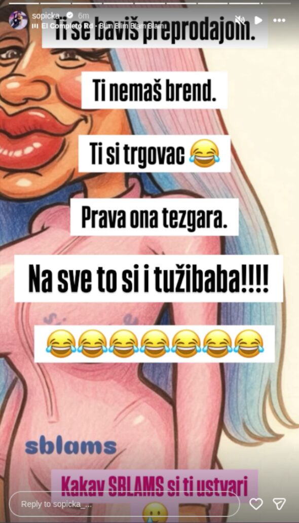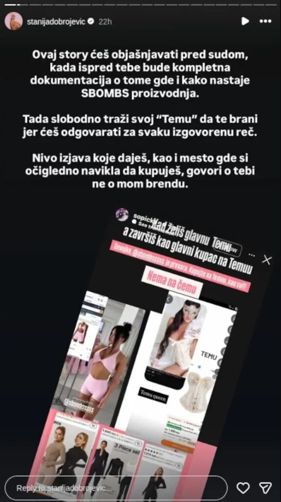 – Ovaj story ćeš objašnjavati pred sudom, kada ispred tebe bude kompletna dokumentacija o tome gde i kako nastaje moja proizvodnja. Tada slobodno traži “Temu” da te brani, jer ćeš odgovarati za svaku izgovorenu reč. Nivo izjava koje daješ, kao i mesto gde si očigledno navikla da kupuješ, govori o tebi, ne o mom brendu – zaključuje Stanija.
