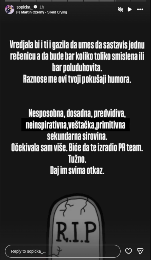 – Ne možeš ti takva nikoga da uvrediš, a kamoli da “sahraniš”. Sahranila si samu sebe, pred publikom. Bruka si za voditeljsku profesiju. Verujem da se mnogi pravi voditelji danas stide i pitaju kako je moguće da se Dželjana Šopić naziva voditeljkom. Zato, draga Dželjana “nesam školovala” Šopić, neke uloge se dobijaju, neke se zaslužuju. A voditeljka se ne postaje titulom, nego nivoom. Ti voditeljka nisi niti ćeš ikad biti, a danas si to i dokazala.