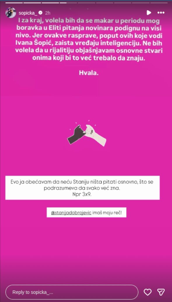 Podsetimo, sve je počelo kada je Stanija odlučila da odgovori na komentare i kritike koje su se pojavile u javnosti, a među kojima su bile i one koje je iznela voditeljka Ivana Šopić.