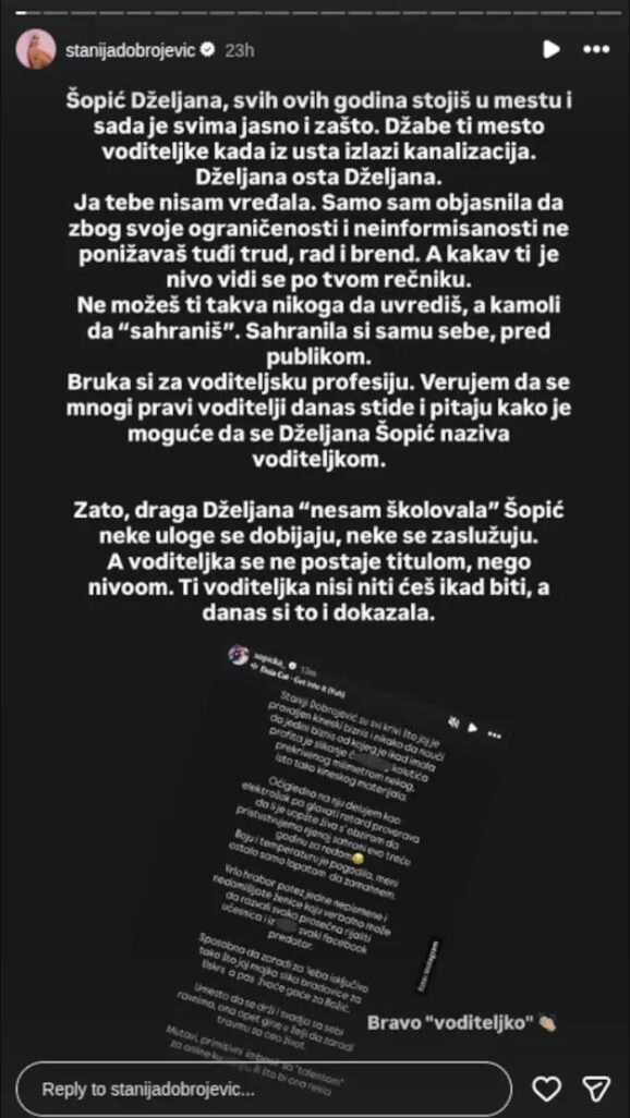 – Šopić Dželjana, svih ovih godina stojiš u mestu i sada je svima jasno i zašto. Džabe ti mesto voditeljke kada iz usta izlazi kanalizacija. Dželjana osta Dželjana. Ja tebe nisam vređala. Samo sam objasnila da zbog svoje ograničenosti i neinformisanosti ne ponižavaš tuđi trud, rad i brend. A kakav ti je nivo vidi se po tvom rečniku – počinje Stanija u svom oglašavanju na Instagramu, pa dodaje: