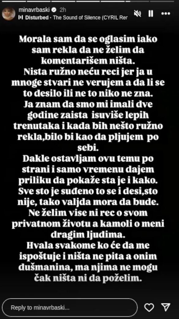 – Hvala svakome ko će da me ispoštuje i ništa ne pita, a onim dušmanima, ma njima ne mogu čak ništa ni da poželim – napisala je Mina Vrbaški u priči na Instagramu.