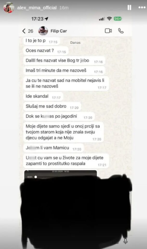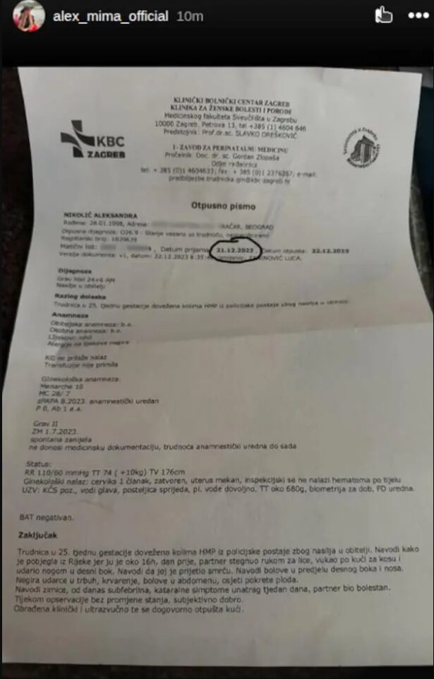 Putem Instagrama oglasila se ponovo, zajedno sa skrinšotovima Filipovih pretećih poruka, kao i nalazima iz bolnice nakon što je, kako Aleksandra tvrdi – fizički nasrnuo na nju.