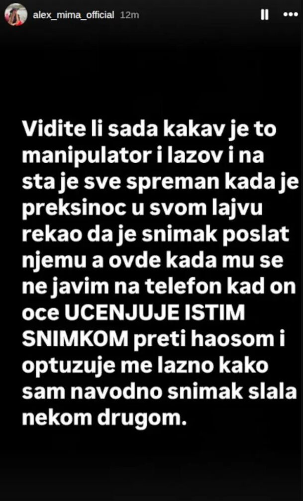 – Vidite li sada kakav je to manipulator i lažov, i na šta je sve spreman? Preksinoć je u svom lajvu rekao da je snimak poslat njemu, a ovde, kada mu se ne javim na telefon kad on hoće, ucenjuje me tim istim snimkom, preti haosom i lažno me optužuje da sam snimak navodno slala nekom drugom.