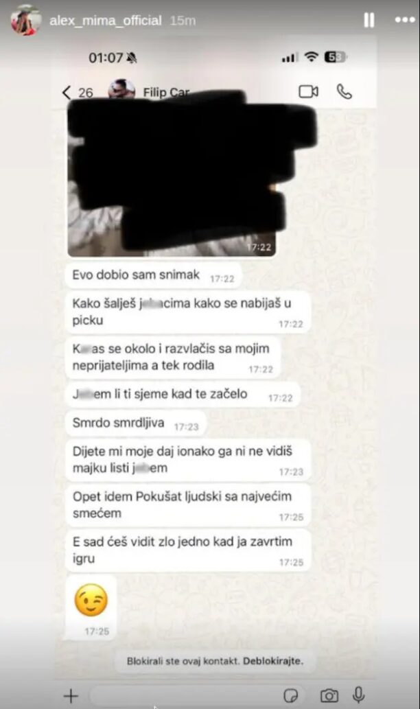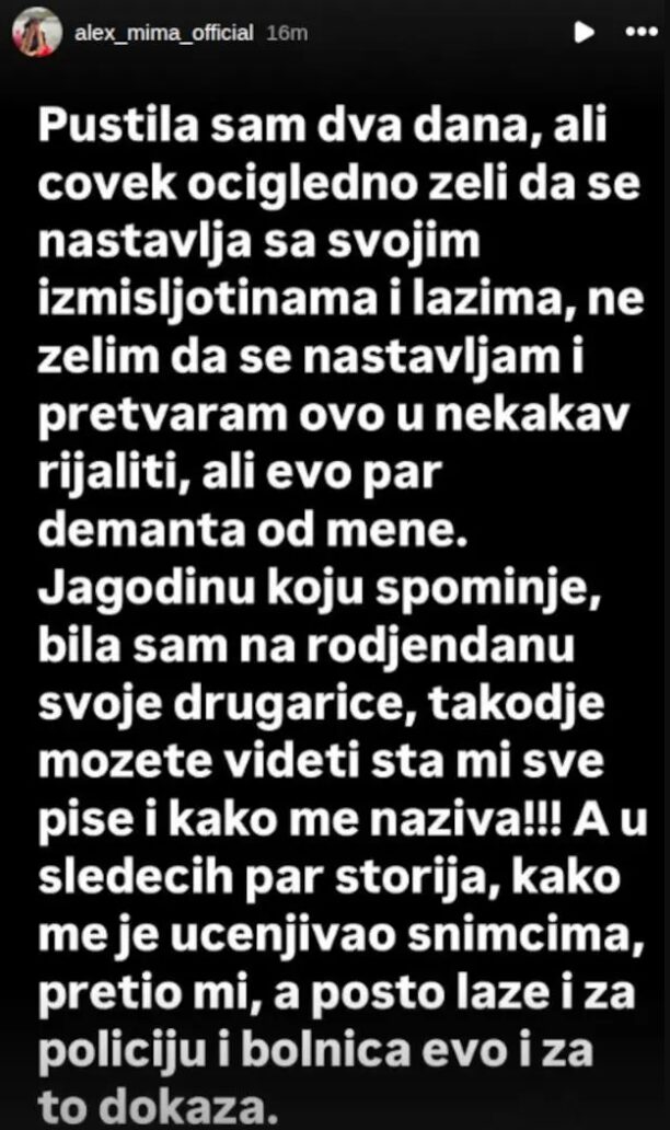– Pustila sam dva dana, ali čovek očigledno želi da nastavlja sa svojim izmišljotinama i lažima. Ne želim da se upuštam u rasprave niti da ovo pretvaram u nekakav rijaliti, ali evo par demantija s moje strane: Jagodinu koju spominje – bila sam tamo na rođendanu svoje drugarice. Takođe, možete videti poruke koje mi šalje i kako me naziva. U narednim storijima pokazaću i kako me je ucenjivao snimcima, pretio mi… A pošto laže i o policiji i o bolnicama – evo i za to dokaza.