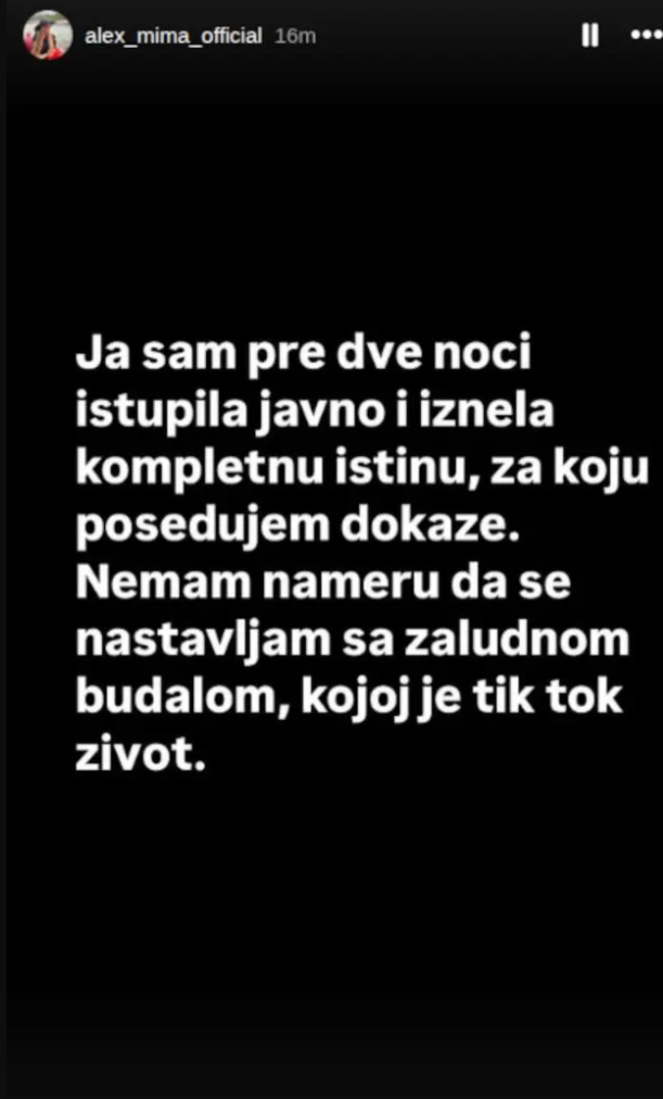 – Ja sam pre dve noći istupila javno i iznela kompletnu istinu, za koju posedujem dokaze. Nemam nameru da se dalje prepucavam sa zaludnom budalom kojoj je TikTok ceo život.