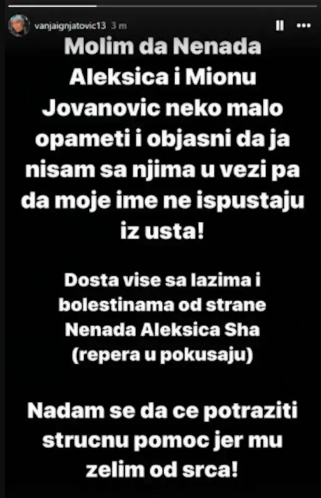 – Molim da Nenada Aleksića i Mionu Jovanović neko malo opameti i objasni da ja nisam sa njim u vezi pa da moje ime ne ispuštaju iz usta! Dosta više sa lažima i boleštinama od strane Nenada Aleksića Ša, repera u pokušaju. Nadam se da će potražiti stručnu pomoć, jer mu želim od srca – napisala je Vanja Ignjatović surovo na Instagram storiju.