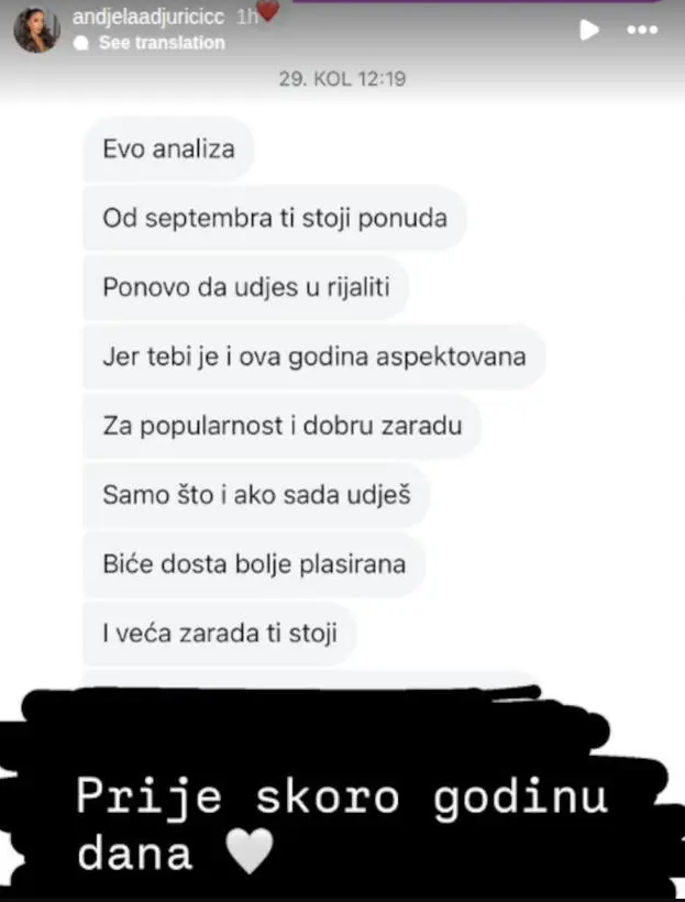 “Od septembra ti stoji ponuda da uđeš u rijaliti” Anđela Đuričić objavila detalje prepiske koja joj život menja iz korena