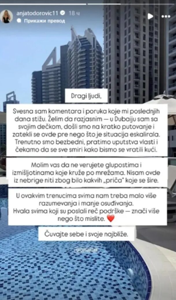 – Dragi ljudi, svesna sam komentara i poruka koje mi poslednjih dana stižu. Želim da razjasnim – u Dubaiju sam sa svojim dečkom, došli smo na kratko putovanje i zatekli se ovde pre nego što je situacija eskalirala. Trenutno smo bezbedni, pratimo uputstva vlasti i čekamo da se sve smiri kako bismo se vratili kući – napisala je ona na svom Instagramu i dodala: