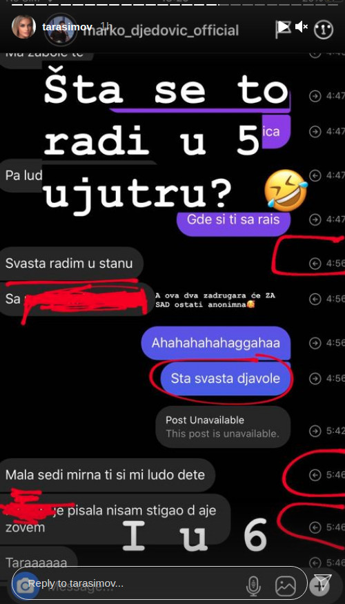 Tara je na Instagram storiju objavila privatne prepiske sa Đedovićem, te otkrila da je on navodno orgijao sa zadrugarima na Obilićevom Vencu.