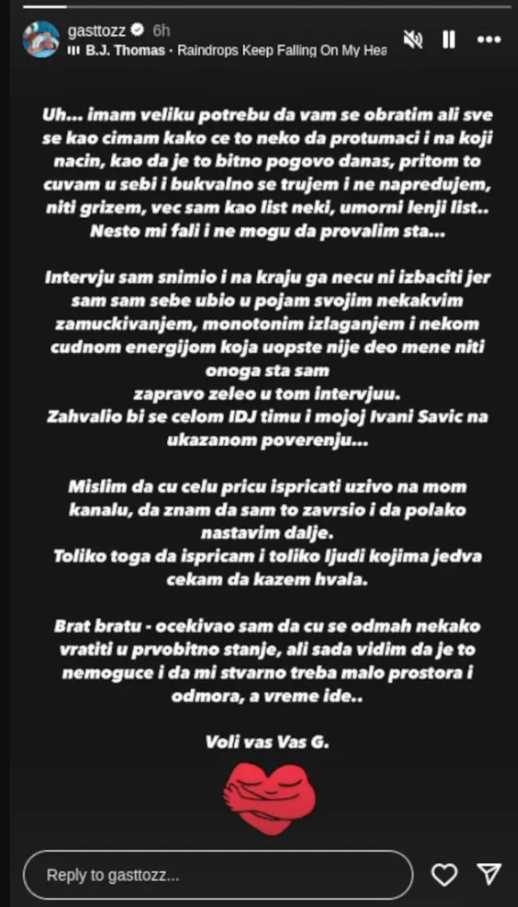 – Uh, imam veliku potrebu da vam se obratim. Ali se sve kao cimam kako će to neko da protumači i na koji način. Kao i da je to bitno, pogotovo danas. Pritom to u sebi i bukvalno se trujem, i ne napredujem, niti grizem, već sam kao list neki, umorni letnji list. Nešto mi fali i ne mogu da provalim šta – bio je iskren Gasttozz.