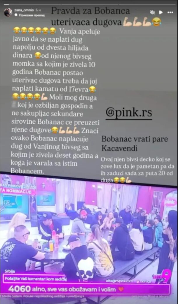 – Vanja apeluje javno da se naplati dug napolju od 200.000 dinara od njenog bivšeg momka sa kojim je živela 10 godina. Bobanac postao uterivač dugova, treba da joj naplati kamatu od 17 evra! Moli mog druga, koji je ozbiljan gospodin, a ne sakupljač sekundarne sirovine, Bobanac će preuzeti njene dugove! Znači, ovako Bobanac naplaćuje dug od Vanjinog bivšeg sa kojim je živela deset godina, a koga je varala sa istim Bobancem – napisala je Žana i dodala: