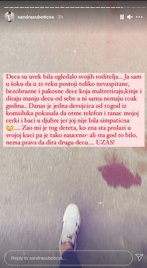 – Danas je jedna devojčica od 10 godina iz komšiluka pokušala da otme telefon i ranac mojoj ćerki i baci u đubre jer joj nije bila simpatična… Žao mi je tog deteta, ko zna šta prolazi u svojoj kući pa je tako naučeno – ali šta god to bilo, nema prava da dira drugu decu… Užas! – napisala je Subotićeva,