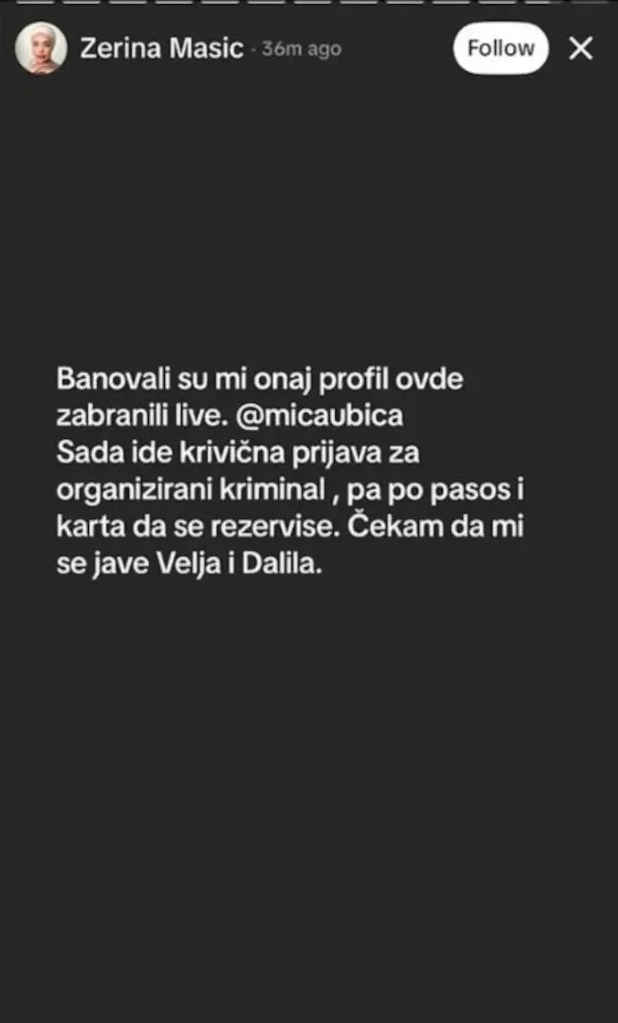 – Banovali su mi profil i zabranili lajvove. Sad ide krivična prijava za organizovani kriminal, pa po pasoš i karte da se rezerviše. Čekam da mi se jave Velja i Dalila – napisala je, a potom i objavila pomalo konfuznu prepisku sa Dalilom.