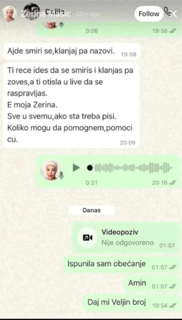 – Ti reče da ideš da se smiriš i klanjaš, a ti otišla u lajv da se raspravljaš. E, moja Zerina. Sve u svemu, ako šta treba, piši. Koliko mogu da pomognem, pomoći ću -napisala joj je ljuta Dalila.
