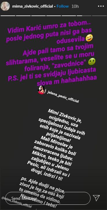 – Vidim Karić umro za tobom… Posle jednog puta, nisi ga baš oduševila. ‘Ajde pali tamo sa tvojim šlihtarama, veselite se u moru foliranja, “zavodnice”… P.S: Je l’ ti se sviđaju ljubičasta slova, m, ahahahhaa – glasio je Mimin odgovor Jeleni.