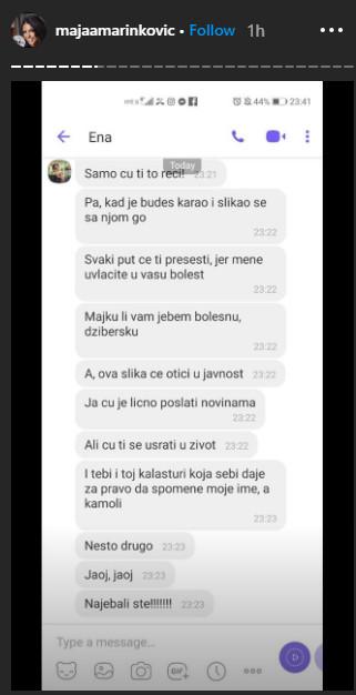 – Samo ću ti to reći, pa kad je budeš k*rao i slikao se sa njom go svaki put će ti presesti, jer mene uvlačite u vešu bolest. Majku li vam j*bem bolesnu, džibersku. A svaka slika će otići u javnost. Ja ću je lično poslati novinarima. Ali ću ti se us*ati u život. I tebi i toj kalašturi koja sebi daje za pravo da spomene moje ime, a kamoli nešto drugo. Jaoj, naj*bali ste – napisala je Ena, Janjušu.