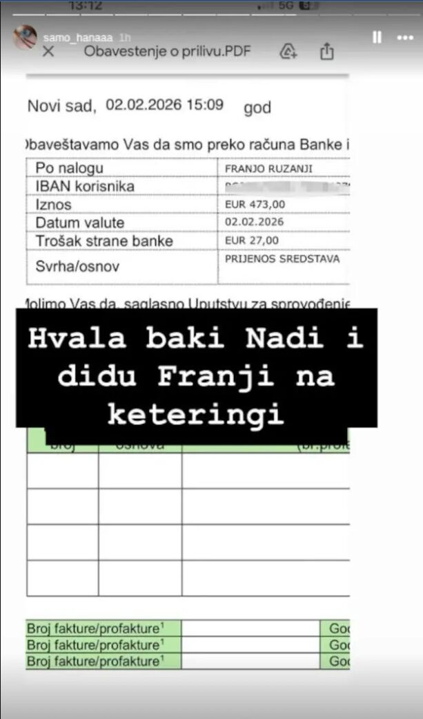 Hanina majka objavila je izvod banke, gde se vidi da je novac za ketering dobila od Neriove bake Nade i dede Franja, roditelja njegovog pokojnog oca Borisa.