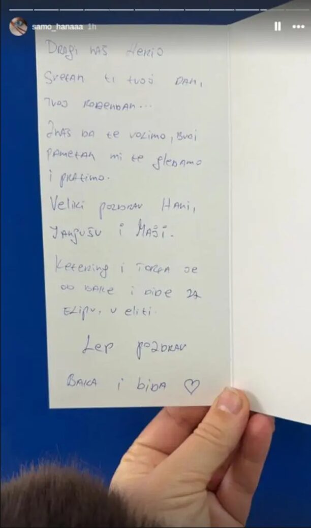 Takođe, kao dokaz priložila je i čestitku gde jasno piše: “Ketering i torta je od bake i dede za ekipu u “Eliti”