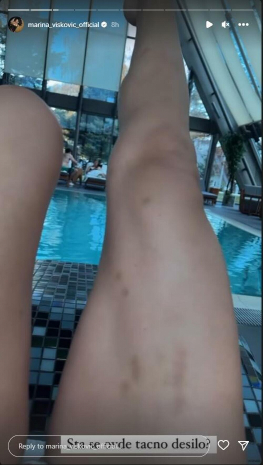 Naime, ona je objavila fotografije pokraj bazena, pokazala je gole noge koje su bile pune modrica i podliva.