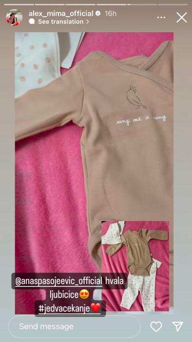 Aleksandra se posvetila sebi i trudnoći, ali je ostala aktivna na mrežama, gde je počela da objavljuje sadržaj vezan za dolazak bebe. Poslednja objava u nizu oduševila je njene pratioce, a buduća mama je uslikala presladak kompletić odeće za svoju bebu, koji joj je poklonila drugarica i bivša zadrugarka Ana Spasojević.