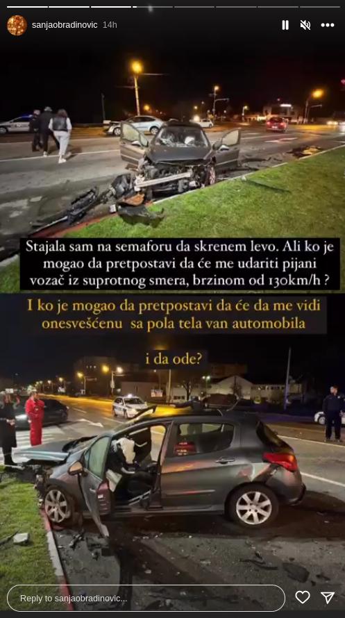 Plesačica Sanja Obradinović putem društvene mreže Instagram otkrila je da je imala saobraćajnu nesreću.