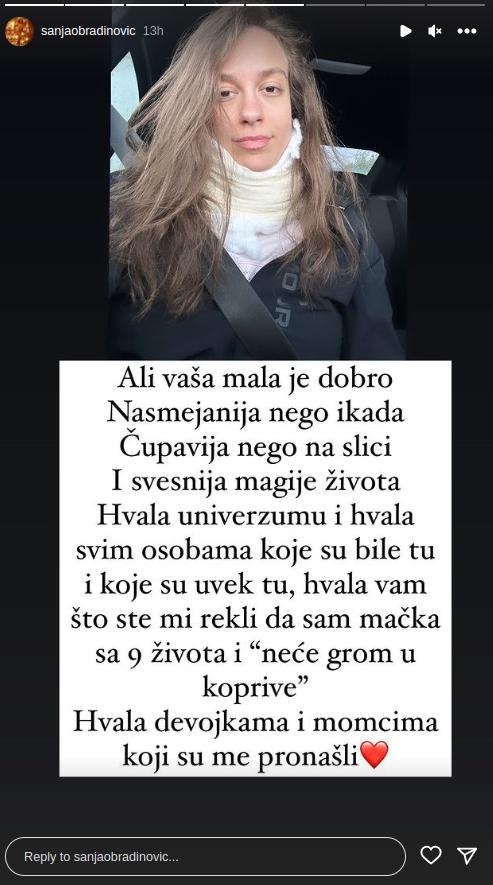 Sanja se potom zahvalila ljudima koji su joj pomogli, te pokazala kako izgleda nakon nesreće.