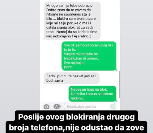 – Nisam ovo zaista želela da uradim, ali ne mogu svako jutro da dobijam stotinu poziva! Mislila sam da će stati i da će imati meru, s obzirom da je nazvao jer je kao zabrinut “šta se to dešava u mojoj vezi u kojoj sam bila u to vreme”, jer eto, igrom slučaja on je saznao kako je meni loše i kako se meni dešavaju ružne stvari, pa da on mene posavetuje kao “prijatelj”. prosvetli ili šta već… Takođe, imam taj celi razgovor, ponavljam jer nisam budala, i znam sa kim imam posla. Bože, baci ciglu i budi precizan. Ne ćutim više nikome niti želim da prikrivam njegove smećarske poteze, a sada neka izvoli i neka kači sve što ima, istine se nikada nisam plašila, kao ni debila od 130-140-150 kilograma – napisala je Dalila.