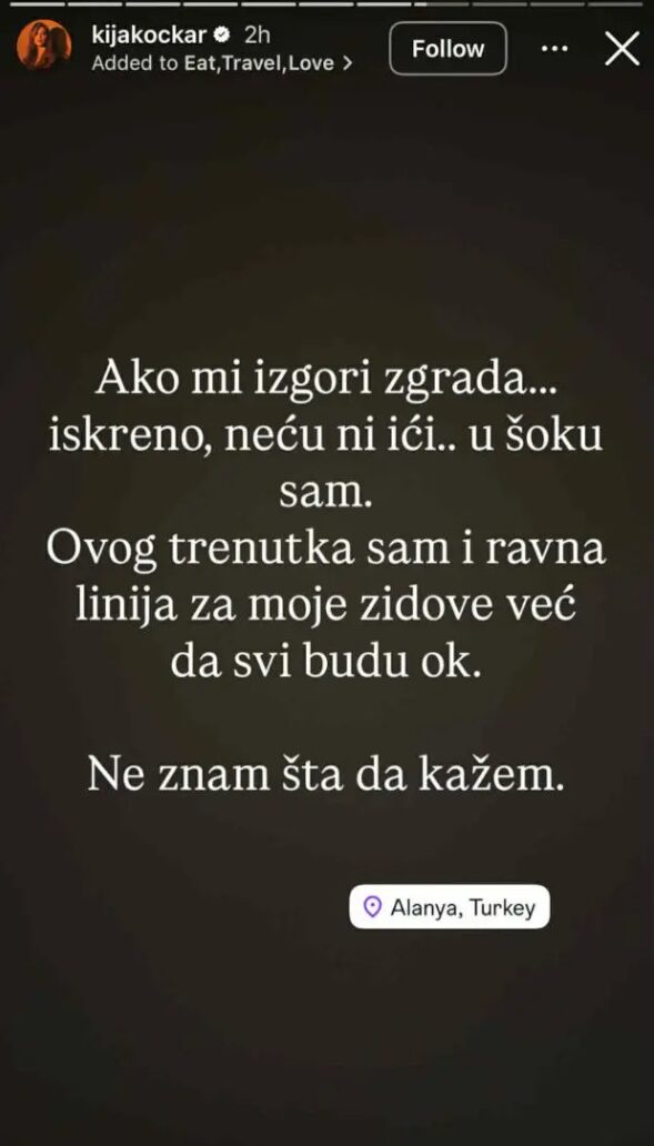 – Ako mi izgori zgrada… Iskreno neću ni ići, u šoku sam. Ovog trenutka sam i ravna linija za moje zidove, već da svi budu ok. Ne znam šta da kažem – napisala je Kija Kockar.